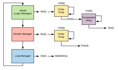 The game works with 3 Managers: World Manager (executes each entity slot), Render Manager (executes each entity draw) and LoopManager.